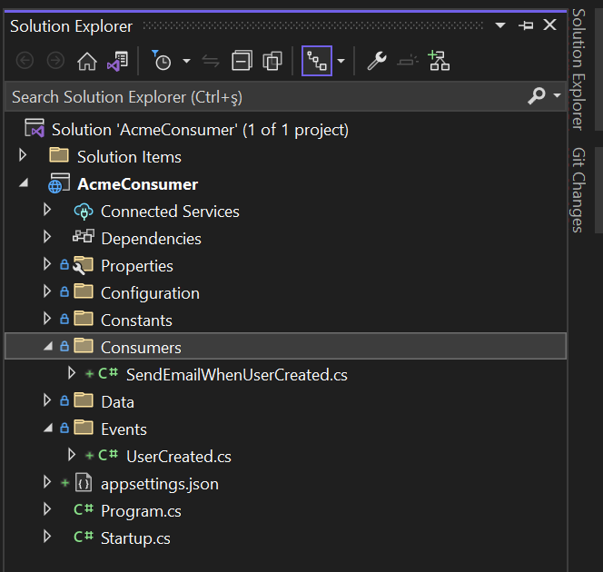 Image below illustrates how we organized our solution structure for Consumer projects at BtcTurk. Every API we create follows same solution structure. Note that this is not necessarily a Console Application but an Api that uses dotnet web sdk instead.